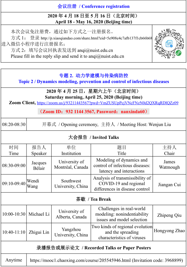 专题2 “动力学建模与传染病防控” 国际学术研讨会将在北京时间2020年4月25日(周六)上午8:20-11:30举行,注册报名及日程安排如下,欢迎广大师生踊跃参加!