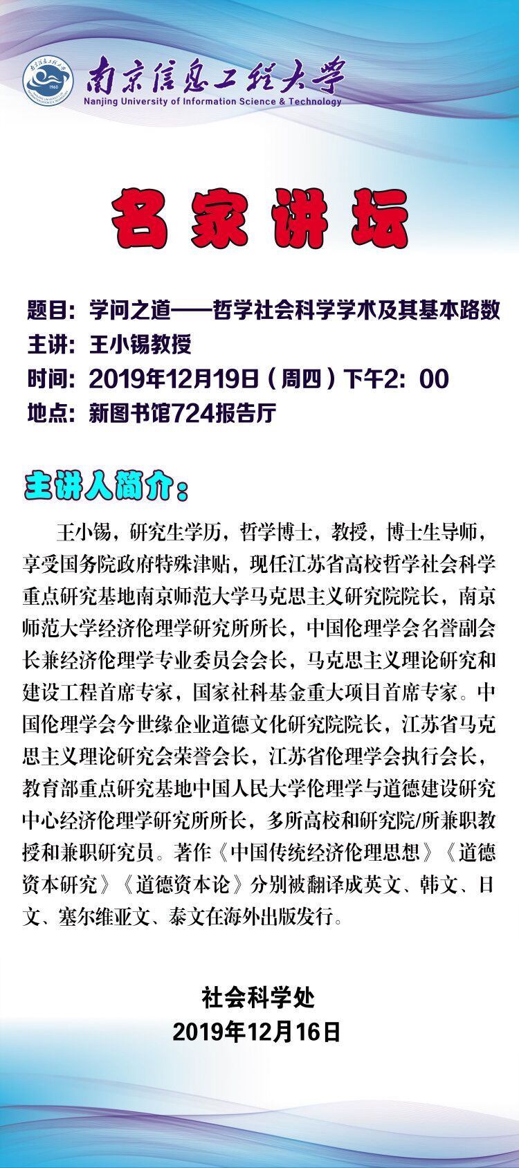 特邀南京师范大学王小锡教授来我校作学术报告