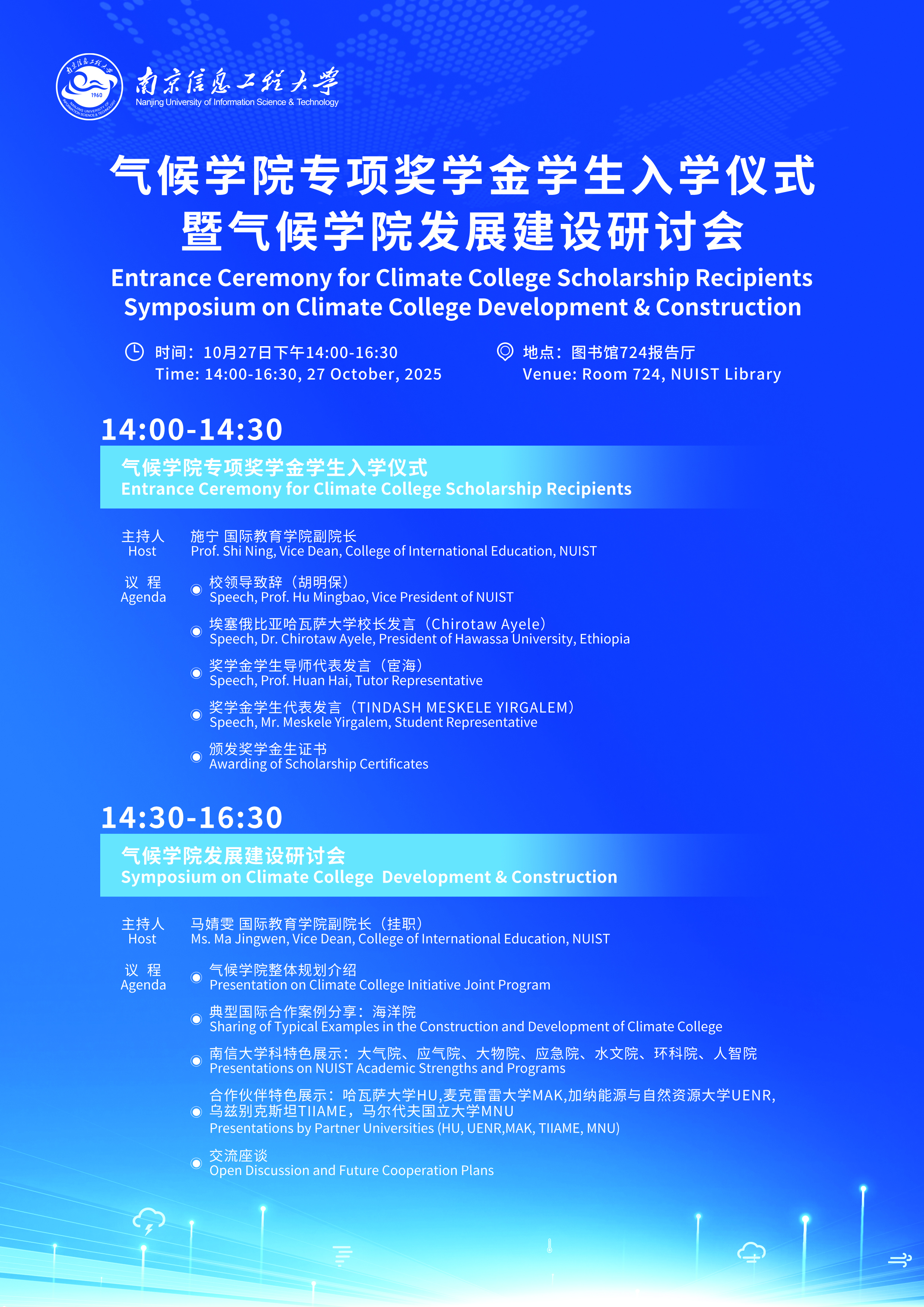 为促进气候学院的建设发展,欢迎首批气候学院专项奖学金学生入学,我校定于2025年10月27日(星期一)下午举办“气候学院专项奖学金学生入学仪式暨气候学院发展建设研讨会”。