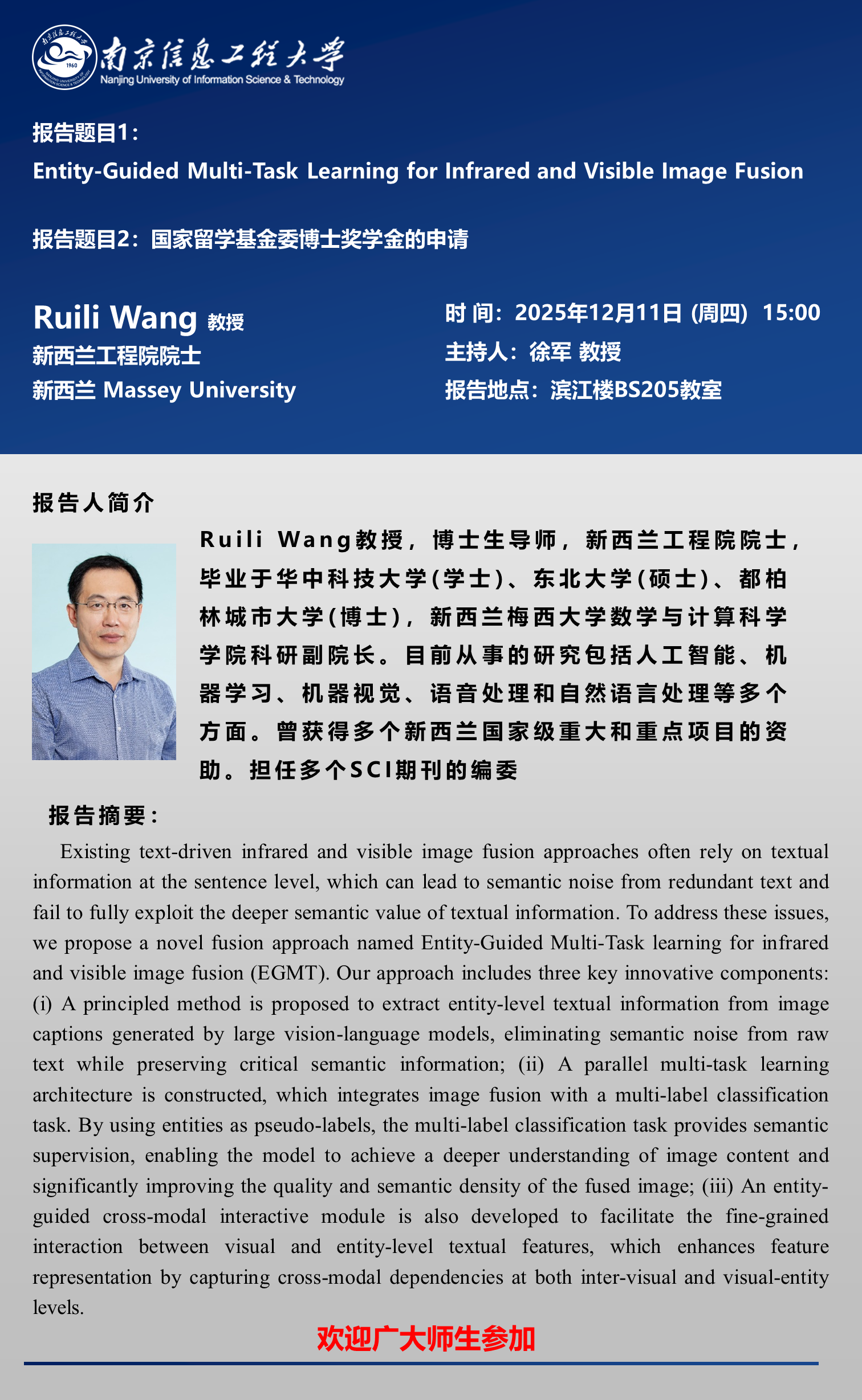 特邀新西兰工程院院士、新西兰梅西大学 Ruili Wang 教授作学术报告