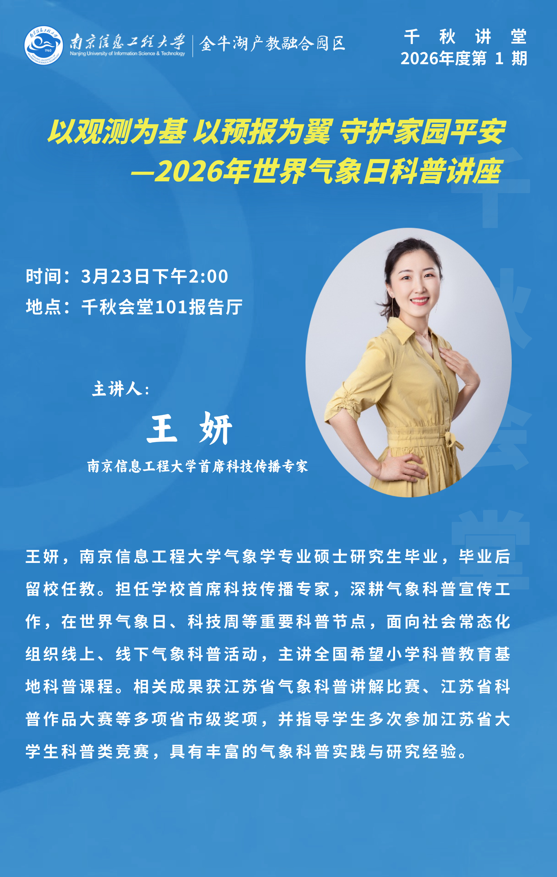 千秋讲堂预告(2026年第一期)—以观测为基 以预报为翼 守护家园平安—2026年世界气象日科普讲座