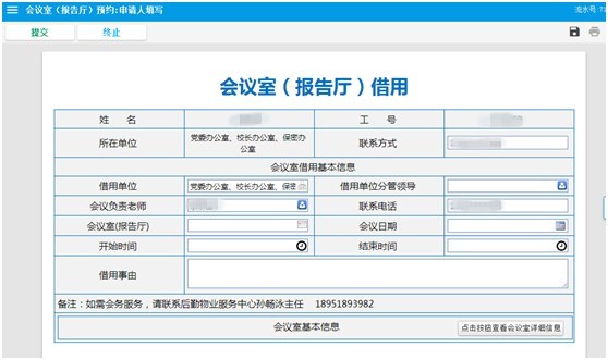 2.试运行期间,使用单位(教职工)可预约预定之日起一个月以内的会议室(报告厅)。预约时须详细注明借用事由、起止时间,明确会议负责老师和分管领导。