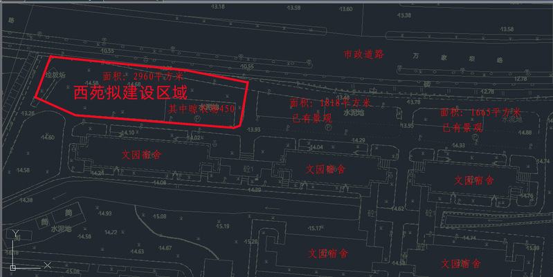 项目位于两个区域,第一个区域位于学校中苑南门沁园41幢学生公寓东侧沿龙山北路区域,具体位置见图1标注范围,可用地面积约1500平方米,拟建设商业用房面积约1000-1500平方米;第二个区域位于学校西苑西北侧文园17幢学生公寓北侧沿万家坝路区域,具体位置见图2标注范围,可用地面积约2700平方米,拟建设商业用房面积约1500-2500平方米。